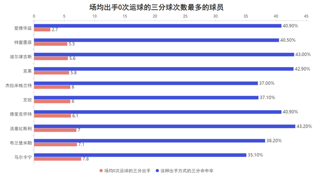 那么接球不运球就直接出手呢?爱德华兹接球就投的三分球场均2.7次排不进联盟前50,并且接球就投的三分命中率高于爱德华兹的大有人在。