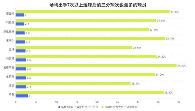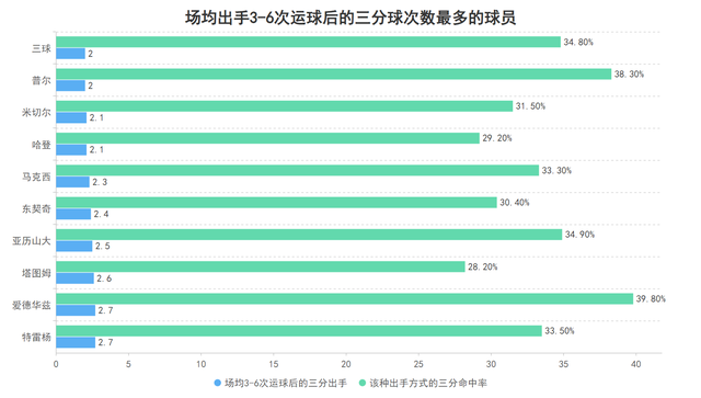 为什么这样说呢?从本赛季联盟各个球员的对比来看,爱德华兹场均出手2.7次3-6次运球后的三分球位于联盟第二,而他39.7%的3-6次运球三分出手命中率却位于出手最多的10名球员中的最高,这意味着在3-6次运球后的三分投射这项能力上,他是联盟产量效率最佳的球员。