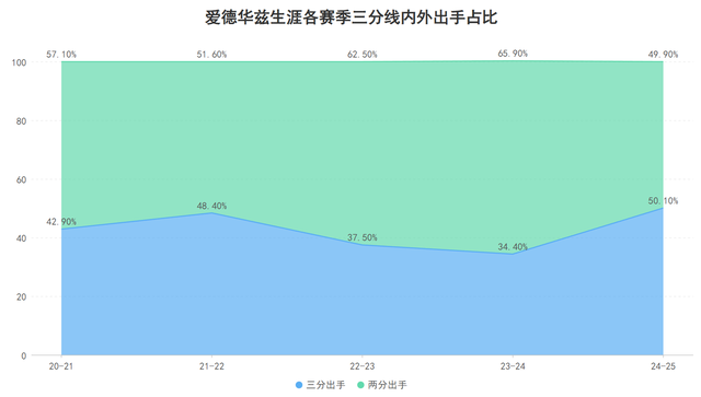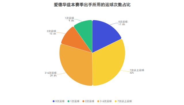 爱德华兹本赛季接球不运球就出手的占比为17.8%,而3-6次运球与7次以上运球后的出手达到了29.8%与32%,这意味着通过多次持球运球后的出手是爱德华兹最为擅长的进攻方式,特别是在三分线外的出手。