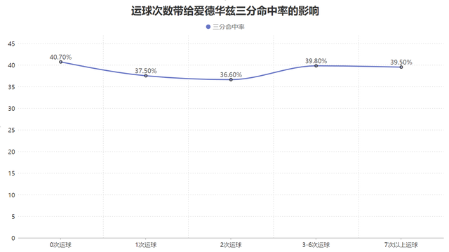 在三分线外爱德华兹接球不运球的出手命中率相对最高达到了40.7%,而持球运球后的三分命中率均在40%以下,但这并不意味着爱德华兹最适合接球直接出手的三分球。
